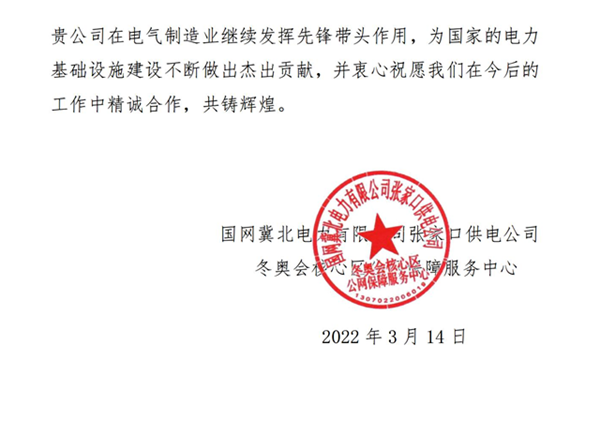 截至目前共有股份公司收到来自国网北京市电力公司、国网天津市电力分公司、国网冀北电力有限公司张家口供电公司、国网冀北廊坊供电公司的感谢信;威思顿公司收到来自国网冀北电力有限公司张家口供电公司的感谢信;国网中电公司收到来自国网冀北电力有限公司张家口供电公司的感谢信;玉麟公司收到来自中铁二局集团有限公司的感谢信。